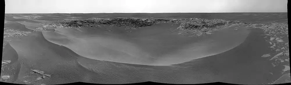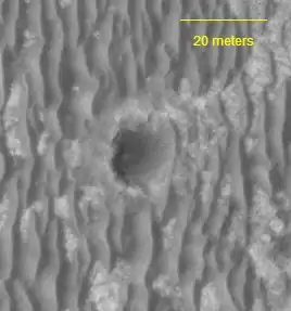 ![]() Кратер Рейнджер, снятый с орбиты аппаратом MRO, камерой выcкого разрешения HiRISE. | |