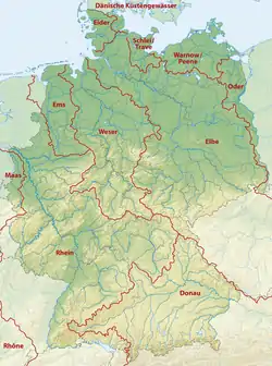 Большая часть рек Германии относится к бассейну Северного моря и в конечном итоге в него впадают, помимо этого в Балтийское море впадает Одер, к бассейну же Чёрного моря относятся Дунай со своими притоками[1].