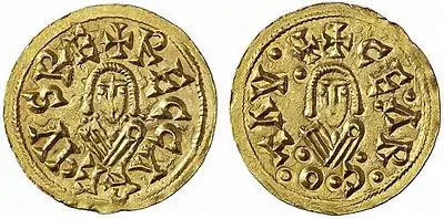 - Первой его женой, возможно, с 587 года была некая Баддо. Эта королева названа в постановлении Третьего Толедского собора от 8 мая 589 года: «Реккаред король … Баддо … королева»[44]. Это единственный источник, который называет первую жену Реккареда. Также ничего невозможно сказать о её происхождении. Если предположить, что именно эта Баддо была матерью сына Реккареда Лиувы, то тогда она должна быть незнатного происхождения, о чём говорит Исидор Севильский[45] и автор Арабо-византийской хроники[46]. Тогда нужно одновременно признать, что Реккаред сожительствовал с ней по крайней мере с 582 года (год рождения Лиувы — 583), то есть ещё до того времени когда Реккаред по замыслу своего отца был просватан за Ригунту, принцессу франков. Помолвка с Ригунтой не удалась, а в 587 году, уже после смерти отца, Реккаред предпринял попытку жениться на Хлодозинде, двоюродной сестре Ригунты, и тоже неудачную. После этого он вполне мог жениться на матери своего сына, несмотря на её незнатное происхождение. Женитьба на наложницах и служанках вполне практиковалась на то время у франков, и могла быть возможной у вестготов. Однако, это не более как догадка и что либо более определённое сказать невозможно из-за недостатка источников. Также вполне допустимо, что королева Баддо и неназванная в хрониках незнатная женщина, мать Лиувы могли быть двумя разными женщинами.