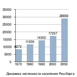 Согласно данным за 2009 год, население Рексберга составляло 28 856 человек.[3] Плотность населения равна 2 237 чел./км². Средний возраст населения — 21 год и 8 месяцев. Половой состав населения: 46,8 % — мужчины, 53,2 % — женщины. Расовый состав населения по оценкам на 2005—2009 годы:[11]