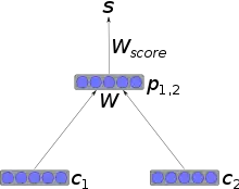В самой простой архитектуре узлы сети сходятся к родителям через матрицу весов скрытого слоя, используемую многократно через всю сеть, и нелинейную функцию активации типа гиперболического тангенса. Если c1 и c2 — n-мерные презентации узлов сети, то их родители также представляют собой n-мерные вектора, вычисляемые как