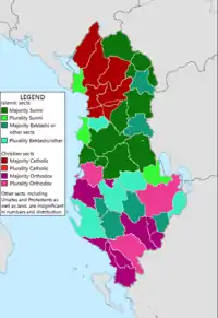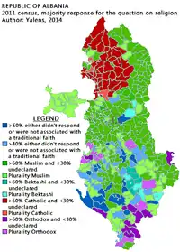 Албания, наряду с частично признанной Республикой Косово, является единственной страной Европы с преобладающим мусульманским населением. Примерно 63[1]—64 %[2] населения Албании является мусульманами; христианство исповедуют 31[1]—32%[2]; ещё 5[1]—6%[2] не религиозны. Согласно данным всеобщей переписи населения, религиозные верования албанцев распределились следующим образом: мусульмане — 58%; христиане — 17%[3]. Однако данные переписи не до конца отражают действительность (в частности, граждане христианского вероисповедания могут не декларировать в открытую свое вероисповедание в целях безопасности, например если проживают в мусульманском окружении), так как почти 20% респондентов отказались отвечать на вопрос о религиозной принадлежности, а некоторые религиозные лидеры призывали бойкотировать перепись или оспорили её результаты[4].