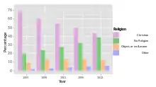 | Христианство | 1 858 977 | 47,65 | 2 027 418 | 54,16 | 2 043 843 | 58,92 | ▼ | |