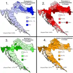 | Всё население Хорватии | 4 284 889 | 86,3 % | 4,4 % | 0,3 % | 0,3 % | 1,5 % | 0,0 % | 0,1 % | 0,1 % | 0,8 % | 3,8 % | 2,2 % | 0,3 % |