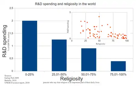 Отношения между религией и наукой могут быть противоречивыми: страны[11], а также штаты США[12] с более высокой религиозностью оказывают меньшую финансовую поддержку науке.