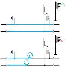 - непрерывный — используется в рельсовых цепях, контролирующих станционные пути и стрелочные переводы; рельсовые цепи могут дополняться аппаратурой кодирования (при этом кодирование рельсовой цепи включается при определении её занятости);