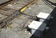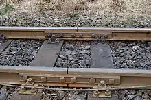 Изолирующий стык[2] с накладками и профильной изолирующей прокладкой между головками рельсов из стеклотекстолита