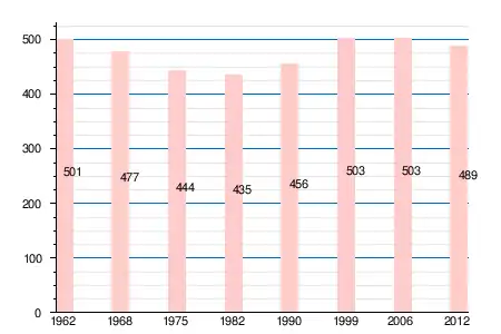 | 1962 | 1968 | 1975 | 1982 | 1990 | 1999 | 2005 | 2006 | 2008 | 2010 | 2011 | 2012 |