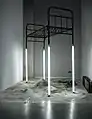 Кронштадт-Сухой док. 2020. 440 х 200 см, энкаустика, х., масло, ящик от РГБ, люминесцентная лампа, соль, песок. Галерея DiDi. Cosmoscow. Мск.