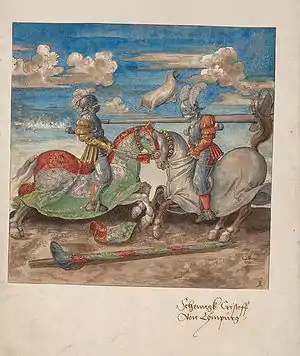 Копья для реннена были тоньше тех, что использовались в гештехе. Сшибки проходили на полной скорости.