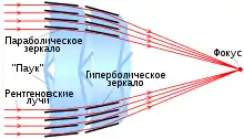 Другое капиллярное устройство — фокусирующая капиллярная трубка, представляющее собой полую коническую трубку со сходящимися капиллярами. Вакуум для рентгеновских лучей является оптически более плотной средой, поэтому, если луч падает на гладкую поверхность капилляра под углом меньше некоторого критического, то он испытывает полное отражение[1]. Этот принцип фокусировки реализован в оптике Кумахова.