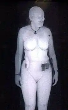 - Сканеры в аэропортах // Ася Патрышева 18.11.2010, Travel.ru: «Рентгеновский сканер похож на две будки, между которыми встаёт пассажир, а сканер микроволновый — это маленькая прозрачная кабинка, где однократно проезжают вокруг антенны.»
