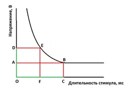 – сила тока порогового трансмембранного стимула; – величина заряда, необходимая для возбуждения одиночной нервной клетки; – длительность стимула.[2]
