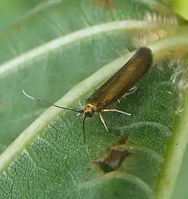 Бабочки мелких размеров. Размах крыльев 11—17 мм. Голова с пучком торчащих чешуек на темени и затылке, лоб округлённый, в прилегающих чешуйках Хоботок развит. Губные щупики 3-члениковые, крупные, серповидно изогнутые вверх. Челюстные щупики рудиментарные, малозаметные. Усики достигают 5/6—9/10 длины переднего крыла, тонкие, голые; базальные членик утолщён. Передние крылья широко-ланцетовидаые, оливковые или медно-фиолетовые, металлически блестящие. Рисунок не развит. В жилковании Sc упирается в костальный край крыла недалеко от середины, Задние крылья широко-ланцетовидные, светло-жёлтые с бурой каймой или тёмно-бурые. Бахрома значительно короче половины ширины крыла.