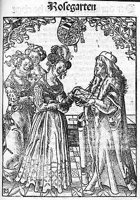 ![]() Евхарий Ресслин дарит свою книгу «Розарий» покровительнице герцогине Екатерине Померанской | |
