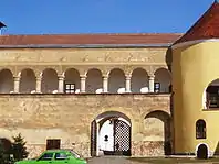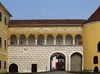 Ворота замка в Крнове до и после реставрации | ||