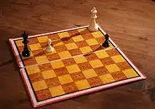 Один из самых известных в мире шахматных этюдов. На первый взгляд кажется, что задание невыполнимо: догнать чёрную пешку белым королём не представляется возможным (1. Крh7 h4 2. Крh6 h3 и т. д.); чёрный же король может легко задержать белую пешку, если та двинется вперёд.