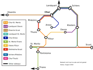 Сеть RhB является крупным перевозчиком в пределах крупного туристического района Санкт-Мориц — Давос с выходом к итальянской границе. Часть железной дороги, линии RhB Альбула и Бернина (в том числе, часть дороги, проходящая по территории Италии до Тирано), являются объектами всемирного наследия ЮНЕСКО[1].