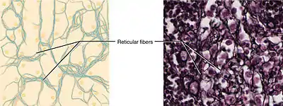 Ретикулярные волокна достигают 0,5—2 мкм в диаметре и синтезируются ретикулярными клетками. Ретикулярные волокна содержат коллаген III типа и некоторых других типов, гликопротеины и протеогликаны. Они устойчивы к действию слабых кислот и щелочей, а также трипсина. Ретикулярные волокна являются аргирофильными, поскольку они выявляются при импрегнации солями серебра, которыми окрашиваются в чёрный цвет (при окрашивании гематоксилином и эозином они не видны). Аргирофильность ретикулярных волокон обусловлена с высоким содержанием углеводных цепей. К числу аргирофильных волокон также относят преколлагеновые волокна, которые представляют собой начальную форму образования коллагеновых волокон, однако ретикулярные волокна, по сравнению с преколлагеновыми, содержат серу, липиды и углеводы в высокой концентрации. В частности, ретикулярные волокна содержат 6—12 % гексоз против 1 % гексоз в коллагеновых волокнах (в отличие от ретикулярных, коллагеновые волокна содержат коллаген I типа, а не III типа). Ретикулярные волокна также красятся положительно при ШИК-реакции за счёт углеводных цепей, как и при импреграции солями серебра. Из-за малого диаметра ретикулярные волокна при окрашивании сириусом красным и визуализации с помощью поляризационной микроскопии приобретают зелёный цвет[6][7].