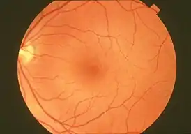 ![]() Сосудистая оболочка глаза человека в норме: диск зрительного нерва слева, макулярная область в центре. | |