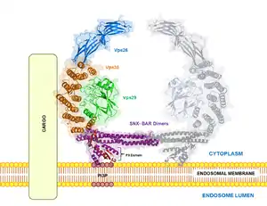 Ретромер человека представляет собой гетеропентамерный комплекс, который состоит из мембранных димеров сортирующего нексина (SNX1, возможно также SNX2, SNX5, SNX6) и вакуолярного белок-сортирующего тримера (англ. vacuolar protein sorting (Vps) trimer), в состав которого входят белки Vps26, Vps29 и Vps35. SNX необходим для привлечения ретромера к эндосомальной мембране; он имеет несколько различных белковых модулей, среди которых домен РХ, связывающийся с фосфорилированным фосфоинозитолом PI(3)P, и домен BAR, отвечающий за димеризацию и прикрепление к изогнутым мембранам (стоит отметить, что эти домены имеются и у других белков, у которых выполняют сходные функции). Связывание ретромерного комплекса с грузом обеспечивается коровым тримером через связывание Vps35 с различными молекулами груза (точнее, связывание последнего с цитоплазматическими хвостами транспортируемых мембранных белков)[5][6].
