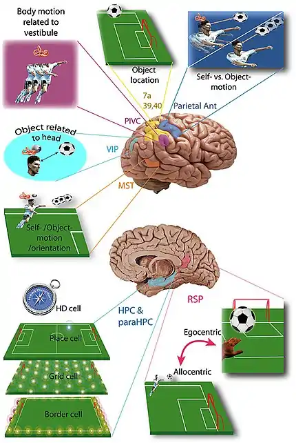Существует предположение, что ретроспленальная кора осуществляет взаимодействие эгоцентрической и аллоцентрической пространственной информации, поскольку анатомически она расположена между гиппокампом (где расположены клетки места, осуществляющие сбор аллоцентрической пространственной информации) и теменной долей коры (которая интегрирует эгоцентрическую сенсорную информацию)[15].