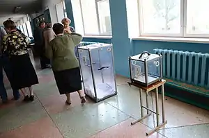 Урна с заполненными бюллетенями на участке для голосования в Донецке.