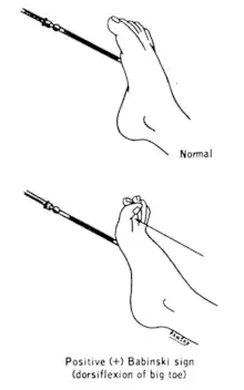 Рефлекс Бабинского свидетельствует о поражении системы центрального двигательного нейрона. Является самым часто проверяемым пирамидным знаком в неврологической практике. Возникает при целом ряде заболеваний, в частности при рассеянном склерозе, детском церебральном параличе, нарушениях мозгового кровообращения, опухолях центральной нервной системы и многих других.