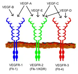 Рецептор VEGF — рецептор с тирозинкиназной активностью, активируемый сигнальным белком VEGF (англ. Vascular endothelial growth factor)[3][4]. Известно три типа рецепторов, которые нумеруются как 1, 2 и 3. В зависимости от альтернативного сплайсинга, они бывают мембраносвязанные и растворимые[5].