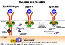 Кроме того, EpoR задействован в подавлении экспрессии рецепторов гибели Fas, Trail и TNFa, которые негативно влияют на эритропоэз.[7][8][9]