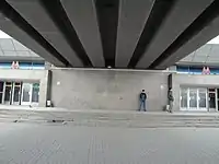 Западный вестибюль, расположенный ниже платформы, имеет выход на нижний уровень, к улице Большевистской и автобусным остановкам.