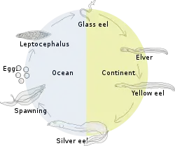 Прожив в реках 9—12 лет, угорь мигрирует («скатывается») обратно в море и отправляется на нерест. В своём движении он, по-видимому, ориентируется по течениям, а согласно отдельным предположениям — и по магнитному полю Земли[7]. Окраска спины становится чернее, а брюхо и бока делаются серебристыми. Только тогда появляются хорошо заметные отличия самцов от самок.