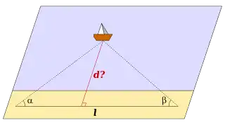 Чтобы определить расстояние от берега до недоступной точки — например, до удалённого корабля,— нужно отметить на берегу две точки, расстояние между которыми известно, и измерить углы и между линией, соединяющей эти точки, и направлением на корабль. Из формул варианта «сторона и два угла» можно найти длину высоты треугольника[22]: