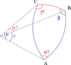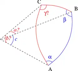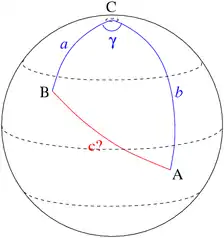 Решение треугольников в сферической геометрии имеет ряд отличий от плоского случая. Например, сумма трёх углов зависит от треугольника; кроме того, на сфере не существует неравных подобных треугольников, и поэтому задача построения треугольника по трём углам имеет единственное решение. Но основные соотношения: две сферические теоремы косинусов и сферическая теорема синусов, — используемые для решения задачи, аналогичны плоскому случаю.