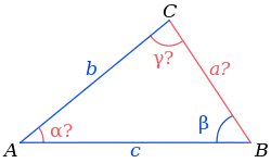 В этом случае решений может быть два, одно или ни одного. Пусть известны две стороны и угол . Тогда уравнение для угла находится из теоремы синусов[8]: