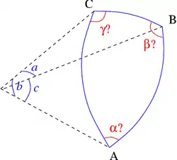 Сферический треугольник общего вида полностью определяется тремя из шести своих характеристик (3 стороны и 3 угла). Стороны сферического треугольника принято измерять не линейными единицами, а величиной опирающихся на них центральных углов.