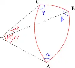 Если даны (в угловых единицах) стороны , то углы треугольника определяются из теоремы косинусов[14]: