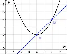 Здесь чёрным цветом показан график функции синим цветом — график функции Абсциссы точек A и B образуют множество решений исходного уравнения: что легко находится проекцией точек на ось абсцисс (ось ). Проверка: и Решение является исчерпывающим, поскольку прямая не может пересечь параболу более двух раз (согласно основной теореме алгебры).