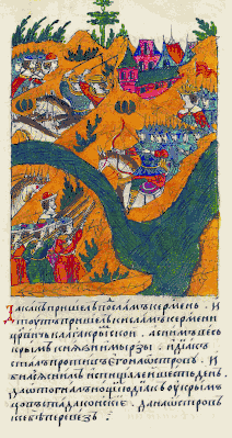 ![]() Лицевой летописный свод: «Да пошли под Очаков, и у Очакова остров взяли и турок и татар побили и языков взяли. А как пошли прочь, за ними пошли санчаки очаковский и тягинский со многими людьми. И Дьяк на них учинил в тростнике у Днепра подсаду, и побил из пищалей многих людей, и сам отошел здраво со всеми людьми. Да как пришел под Ислам-Кирмень, и тут пришел к Ислам-Кирменю султан калга крымский, а с ним весь Крым, и князи, и мурзы. И Дьяк стал против него на острове и бился с ним из пищалей 6 дней, да отогнал ночью Дьяк у крымцев стада конные да на остров к себе привез» | |