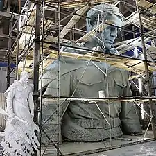 Константин Фомин опытным путём определил размер скульптуры: на месте возведения поднимал краном макет на различную высоту, тем самым подгоняя размер скульптуры под масштабы местности[36]. В мастерской Коробцова и Фомина началась работа. По подходящим эскизам, которых было более 80[37], создана детально проработанная гипсовая модель солдата высотой 2,5 метра, после чего авторы приступили к лепке полномасштабной фигуры из 100 тонн голубой кембрийской глины[38][39].