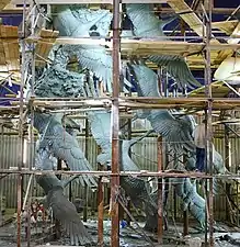 С 21 августа по 20 декабря 2019 года производилась отливка центральной скульптуры. Вылепленную глиняную фигуру формовали и разделили на более чем 600 частей[37]; каждую часть по отдельности отлили из 80 тонн специальной бронзы в Солнечногорской литейной мастерской скульптора Александра Рукавишникова. Каждая такая часть весила в среднем 50—100 кг[43][44]. Параллельно в мастерской эти части с использованием аргона сваривали снаружи, а изнутри скрепляли болтами[35]. Таким образом собирались крупные фрагменты скульптуры, затем ещё раз разделялись на части поменьше для удобства транспортировки и монтажа. Так, часть скульптуры — кисть с автоматом ППШ образца 1941 года — имела длину 9 метров и массу около 2,5 тонн[45]. На сварку частей ушло около 30 км бронзовой проволоки.