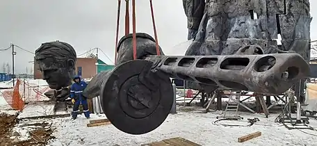 С 28 ноября 2019 года на строительную площадку начали завозить фрагменты скульптуры: голова, плечи, торс, пояс. Именно в таком порядке производился монтаж будущего памятника — сверху вниз, начиная с плеч[46]. Рядом со скульптурой проводилось строительство павильона музея. В то же время на металлообрабатывающем заводе «Синергия» в Санкт-Петербурге приступили к производству панелей из листов кортеновской стали размером 6 на 2,5 метра с нанесением методом лазерной резки фотографий и имен погибших в сражениях подо Ржевом солдат[47][48].