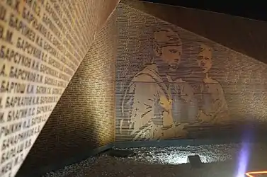 Перед центральным холмом сделана ещё одна насыпь высотой до 6 метров, сквозь которую к мемориалу коридором прорезана 55-метровая аллея. Её зигзагообразно изломанные стены облицованы гранитом, поверх которого смонтированы покрытые искусственной ржавчиной металлические панели. На них сквозной резьбой нанесено более 17 тысяч фамилий павших в ходе Ржевской битвы, а также портреты солдат[12].