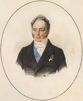 Граф (с 1856) Александр Иванович Рибопьер (20 апреля [1 мая] 1781, Санкт-Петербург — 24 мая [5 июня] 1865, Санкт-Петербург) — русский придворный и дипломат швейцарского происхождения, управляющий государственными банками, действительный тайный советник, масон. Знаменитый в своё время красавец, блестящую карьеру при дворе сделал ещё в юности, при императоре Павле и в начале царствования Александра I. При пяти монархах он был, по свидетельству М. А. Корфа, «человек домашний во дворце»[2].