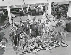 ![]() Олимпийская команда США по гребле на каноэ 22 июля 1936 года на борту корабля «Президент США Хардинг». Эрнест Ридель во втором ряду третий слева. | |