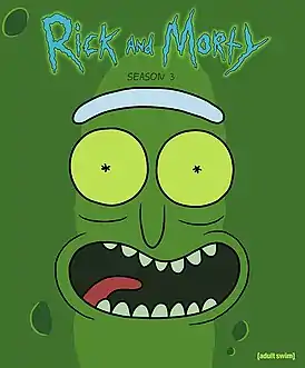 Третий сезон был выпущен на DVD и Blu-ray 15 мая 2018 года с особыми функциями, включая эксклюзивные комментарии и аниматики для каждого эпизода, происхождение Рика и Морти, материал «внутри эпизода» и эксклюзивный материал «внутри записывающей кабины»[42]. Звезда «Игры престолов» Питер Динклэйдж и шоураннеры Дэвид Бениофф и Д. Б. Уайсс записали аудиокомментарии к эпизоду «Огурчик Рик». Другие комментарии гостей включают Мэрилина Мэнсона, Кортни Лав, Рассела Брэнда[43] и победителя краудфандинговой кампании, запущенной Джастином Ройландом и Дэном Хармоном Planned Parenthood[44]. В своём обзоре Blu-ray для Forbes Люк Томпсон описывает релиз как «тщательный набор, который, кажется, охватывает все аспекты и доставит часы удовольствия даже тем фанатам, которые уже смотрели каждый эпизод по несколько раз»[45].