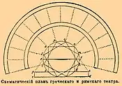 Витрувий даёт точное описание плана и сооружения римских театров, как бы устанавливая два независимых один от другого типа театров. Уклонения римского театра от греческого объясняются сокращением, потом полным упразднением роли хора и в зависимости от этого делением орхестры на две части: и то, и другое началось ещё у греков и только получило у римлян законченное развитие.