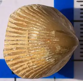 Известковая раковина двояковыпуклая, ребристая с хорошо развитым синусом и седлом, арея узкая.