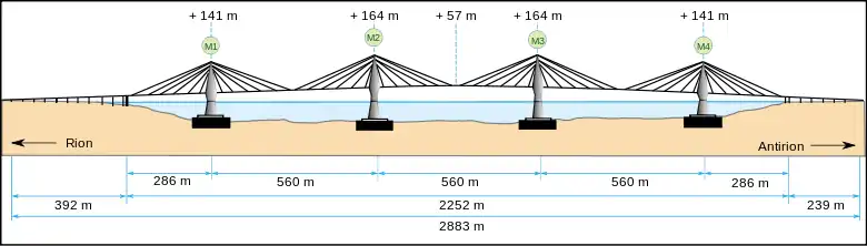 Длина моста Рион — Андирион составляет 2880 м, на 2015 год он всё ещё является самым длинным вантовым мостом в Европе. По длине основного пролёта (560 м) он является на начало 2015 года 31-м мостом в мире, хотя на момент открытия был 10-м в этом списке.
