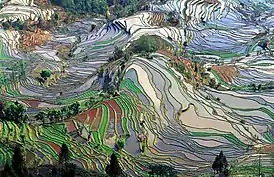 Расположены в южно-китайской провинции Юньнань рисовые террасы Хунхэ-Хани насчитывают более 1300 лет[3]. Местные жители и сегодня выращивают на этих террасах рис.
